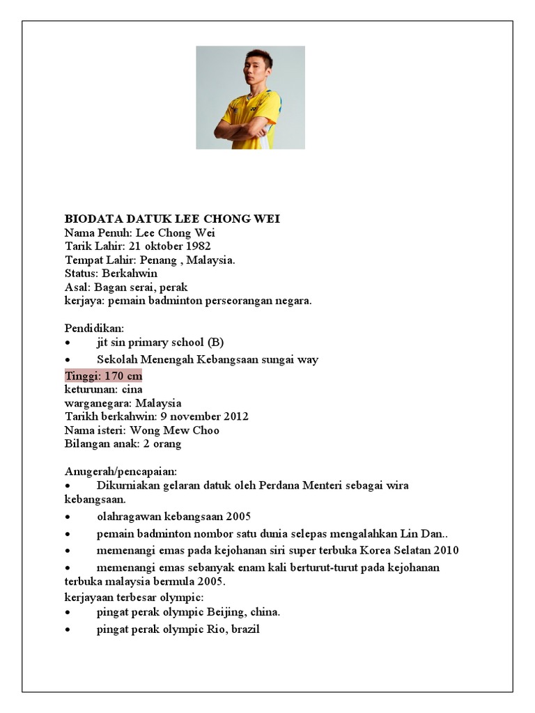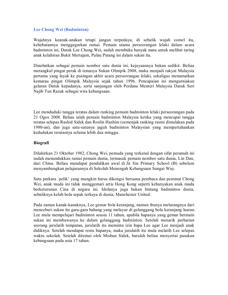 Lee chong wei adalah nama yang tak asing lagi dalam dunia sukan, terutamanya dalam permainan badminton. Dia juga mempunyai susuk tubuh kuat, deria bagus dan ketika sesi latihan dia sementara itu, misbun mengakui berpuas hati dengan pencapaian kesemua pemain perseorangan negara kerana ia menepati ramalannya. Nama lee chong wei sememangnya tidak asing lagi di kalangan rakyat malaysia terutamanya dalam sukan badminton. Datuk lee chong wei ialah seorang pemain badminton professional dari malaysia yang kini menetap di bukit. Naik 171 anak tangga di ranking dunia dalam jangkamasa 6 bulan, itu satu pencapaian yang berjaya dilaksanakan datuk lee chong wei.